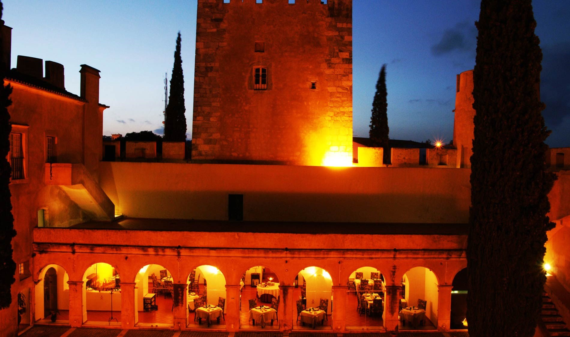 A sala do restaurante tem vista para o pátio interior e é aqui, com vista para janelas islâmicas e ciprestes alentejanos, que pode saborear o melhor que a gastronomia da região tem para lhe oferecer.