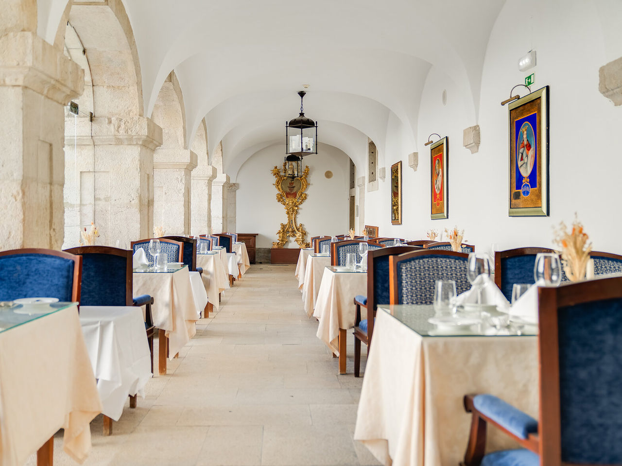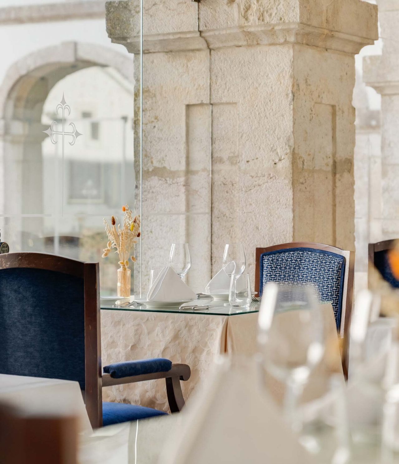 Das Restaurant der Pousada Castelo Palmela bietet ein unvergessliches gastronomisches Erlebnis in der einzigartigen Umgebung des ehemaligen Refektoriums des Ordens der Kriegermönche.