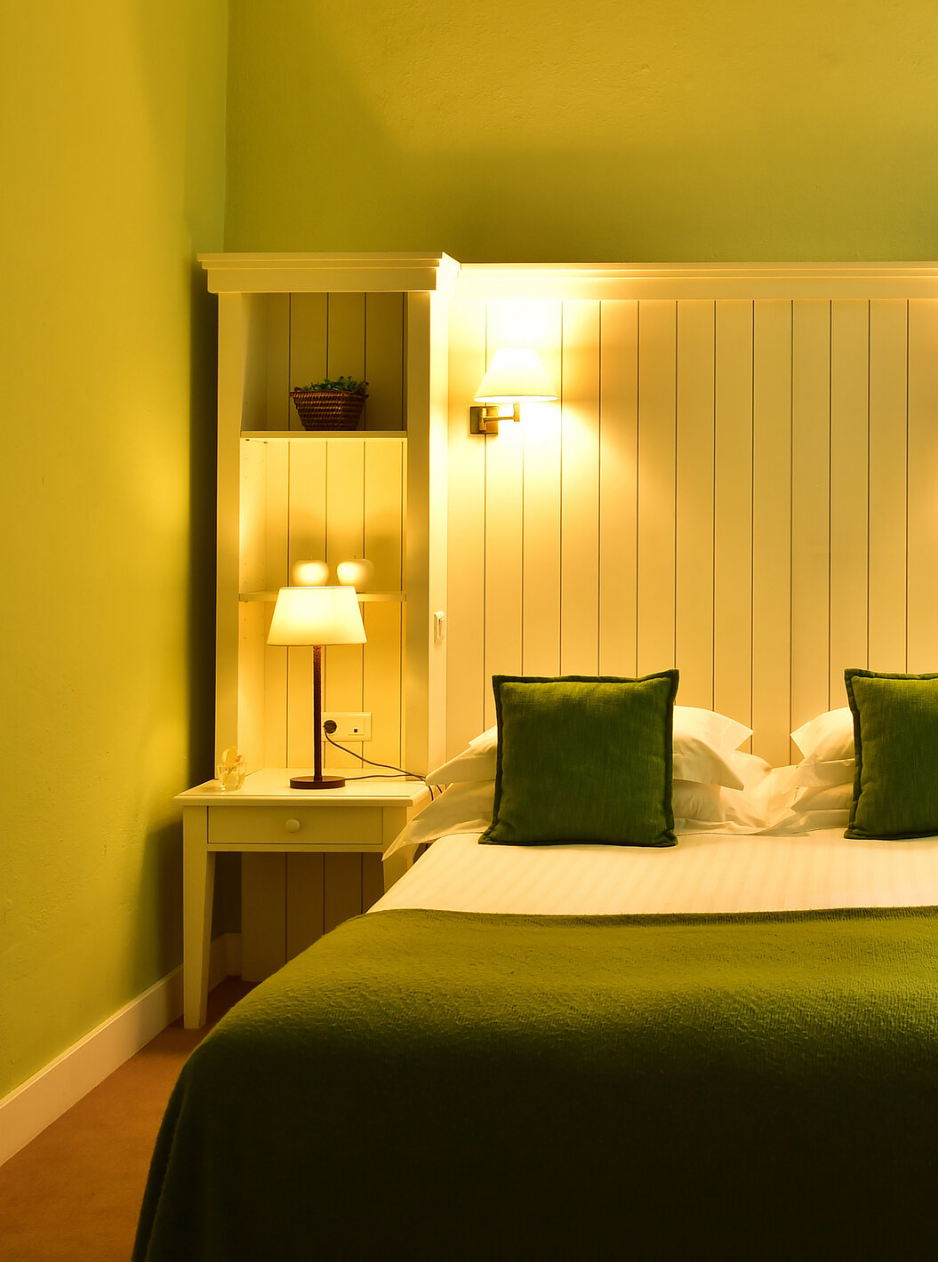 O Quarto Superior da Pousada Convento Évora conta com duas camas separadas, com uma colcha beje com padrão e paredes verdes